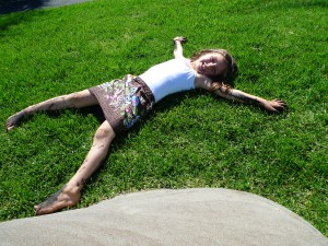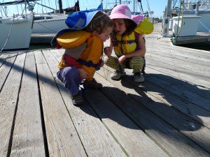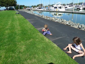 Ruby’s tag game seemed to be chase Olive and then push her over. She’d get up, she’d chase, she’d push (hard) and eventually she didn’t want to play that anymore. Ruby got mad at me for asking her to be gentle and stormed off to play in the mud at the edge of the grass. Olive joined and and they got pretty darned muddy. I didn’t think it was a terribly big deal because we had access to bathrooms and 64 faucets and hoses between the lawn and our boat that I could rinse them off in. And again it was a remarkably warm day out so we could even string their clothes on the lifelines to dry.