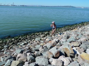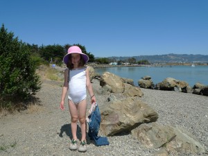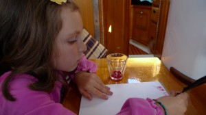 When we got back on the boat Olive napped, Tucker worked and Ruby engaged in a pressing project to paint with a feather that she found on Angel Island. Naturally the first order of business was avian identification. We looked for the feather in a bird identification book and then a sea bird book. At one point Ruby piped up, “Mom, find the section that tells you which birds live on Angel Island.” After the feather had been satisfactorily identified, Ruby attempted to apply a tree frog temporary tattoo onto the feather and then, finally, got out the watercolor paper and the liquid water colors in a glass and she painted.