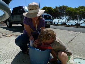 At some point they started to itch so I grabbed my bag, Tucker’s camera, Olive shoes, and Ruby’s backpack, and pushed her bike while he held her shoes and she pushed his bike (not touching the handle bars) back to the ManVan. Then we packed most of our stuff into a dock cart so I could roll them down to our boat for some cleaning up, as they weren’t clean enough to go into the showers without a pre-wash. Ruby did come up with the clever idea that we could make a path of disposable bathmats from the bathroom door to the shower for them to walk across (but by now you can probably imagine that my kids aren’t exactly capable of remaining on the path so we skipped that).