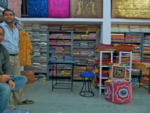 Once the demo is over, we poke around downstairs for a bit longer and then head back up to look at saris, the real reason for our visit. Khan and King pull out dozens of saris and describe their various qualities and styles. I keep reminding them “No reds, my wife doesn’t care for red.” “Perhaps this one sir”, King says as he shows me another red one. Finally I’ve selected my favorite and move on to the purchasing. I start at 50% below asking price.